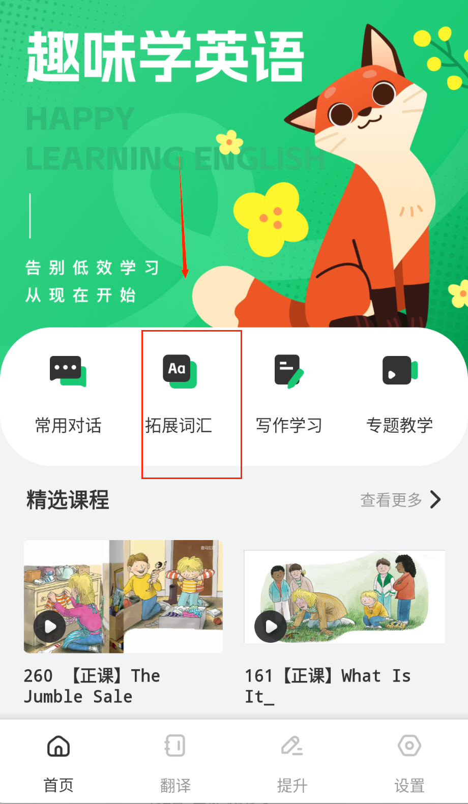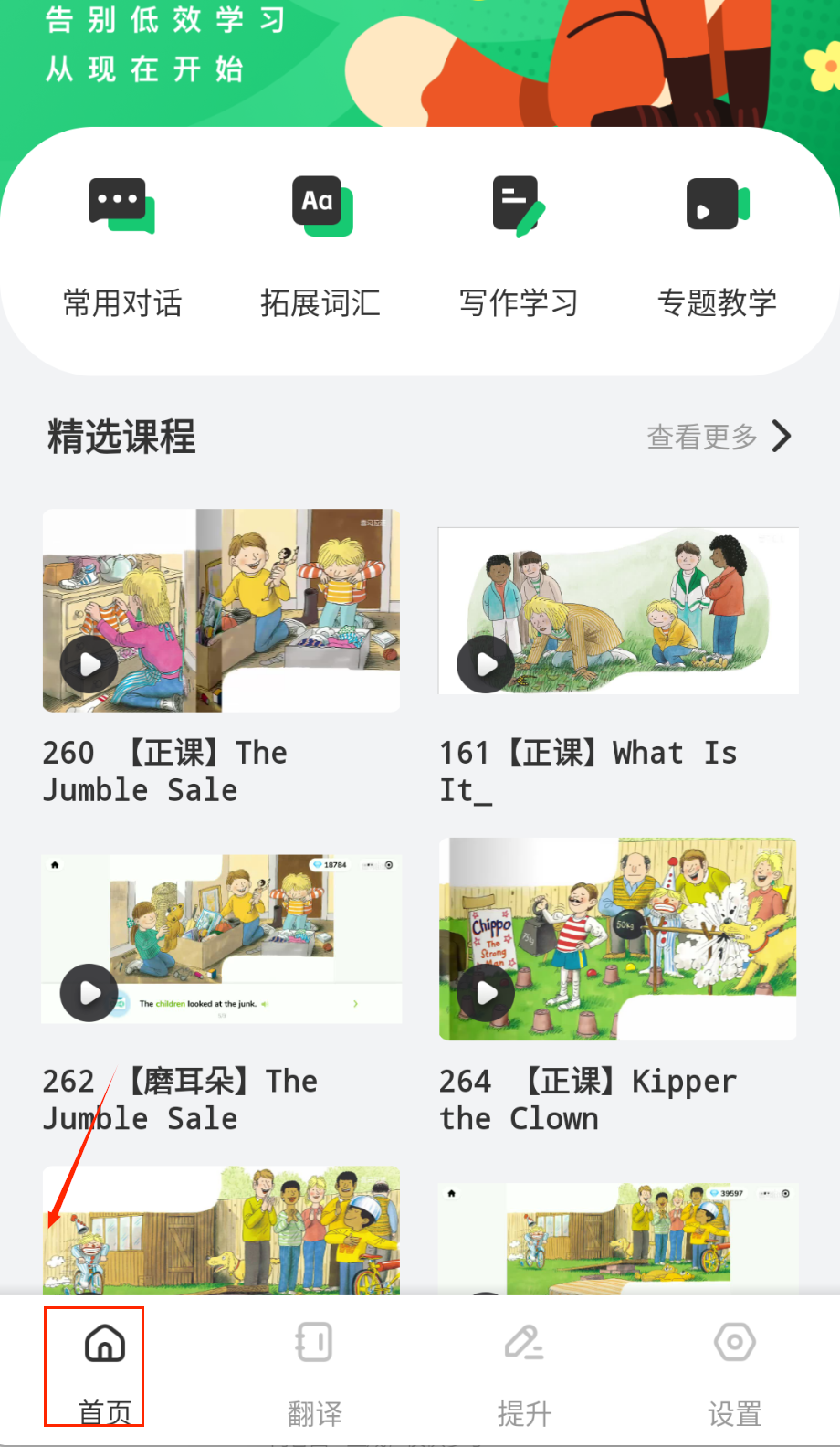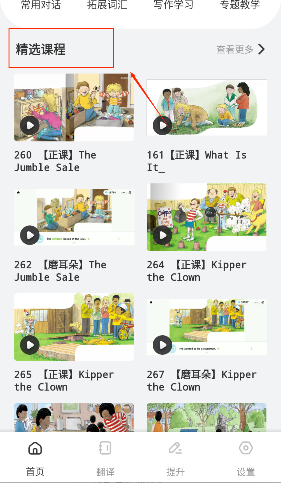 4、在课程中心按年龄和难度分级筛选资源,包含自然拼读/情景对话/绘本阅读等八大类目,选择专题后开启阶段性学习计划。