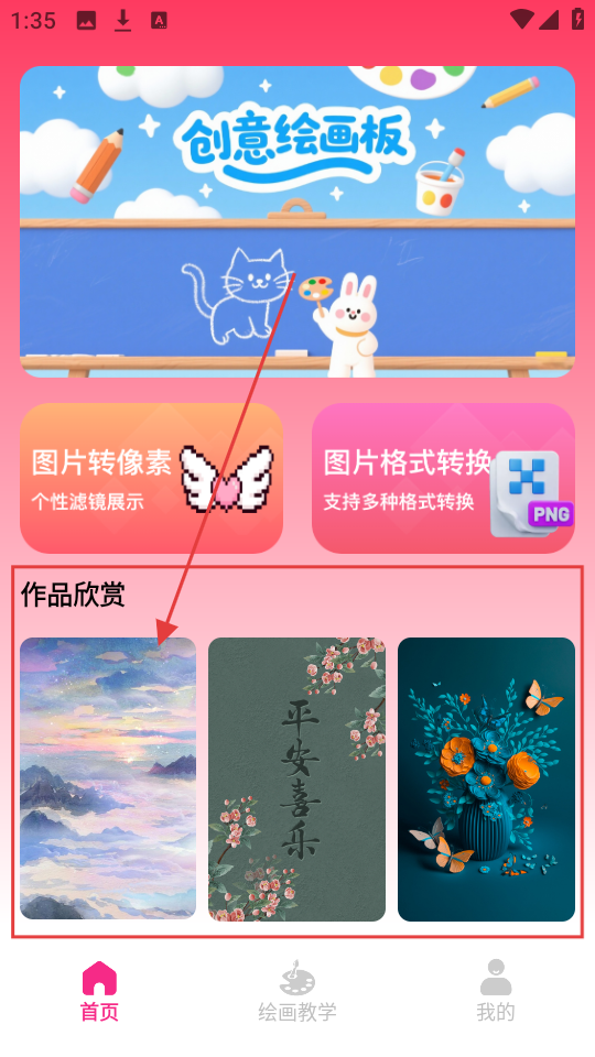 1、在首页,【作品欣赏】区域有不少精美画作,点击喜欢的画作,能查看更细致的内容,还能感受绘画魅力呢。