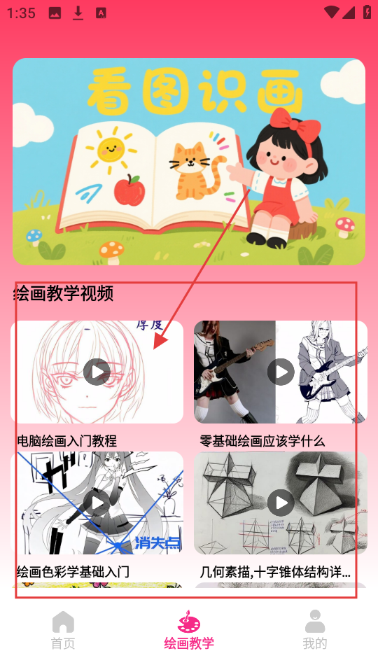 3、切换到【绘画教学】页面,这里有很多绘画教学视频,像【电脑绘画入门教程】等,可根据需求选择学习。