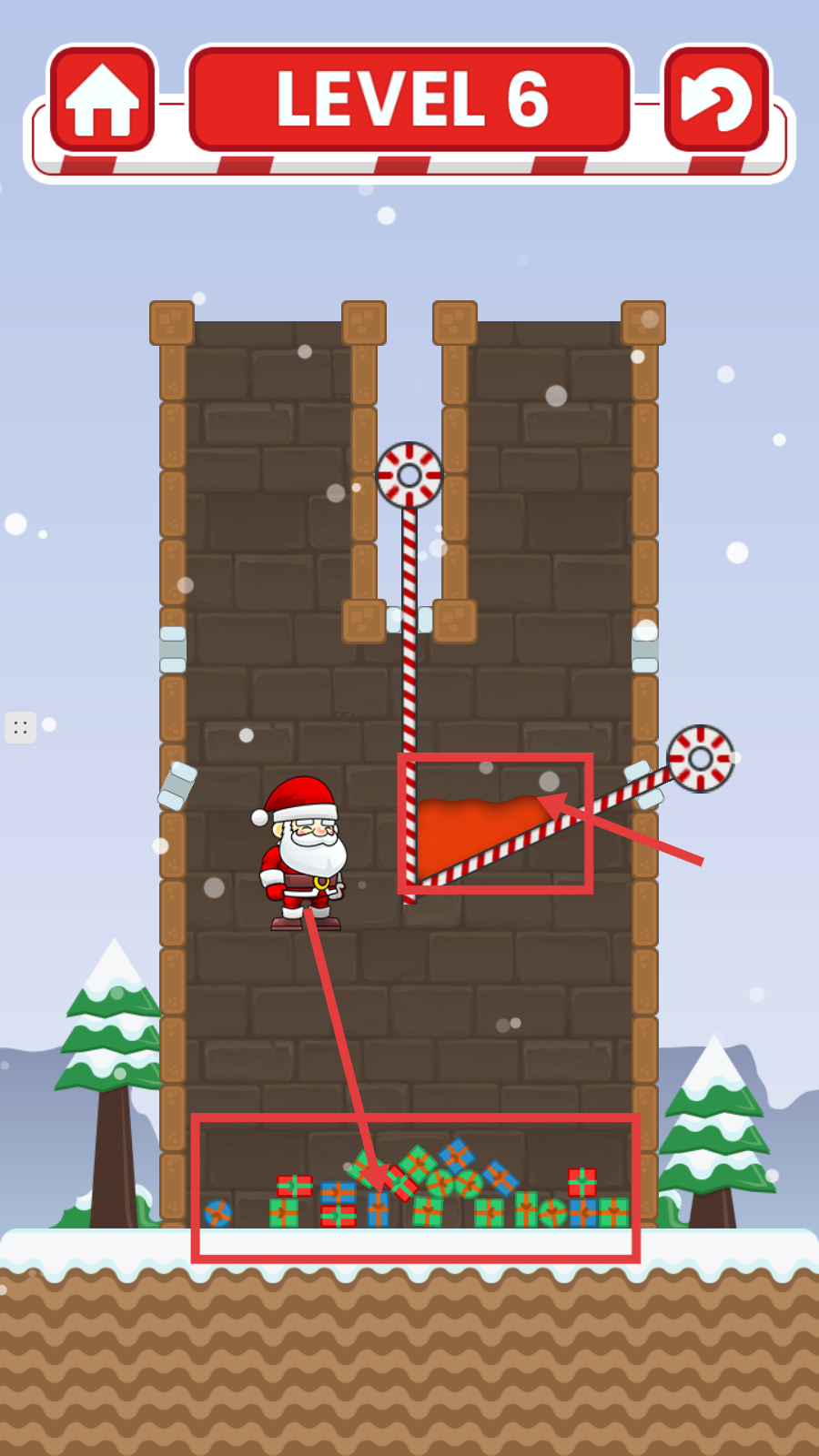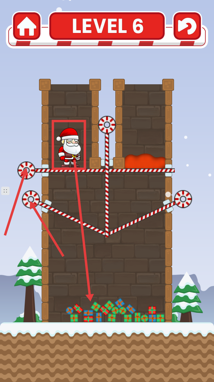 2、在Level-6里,观察圣诞老人周围的机关与礼物分布,需通过操作机关让他安全移动。