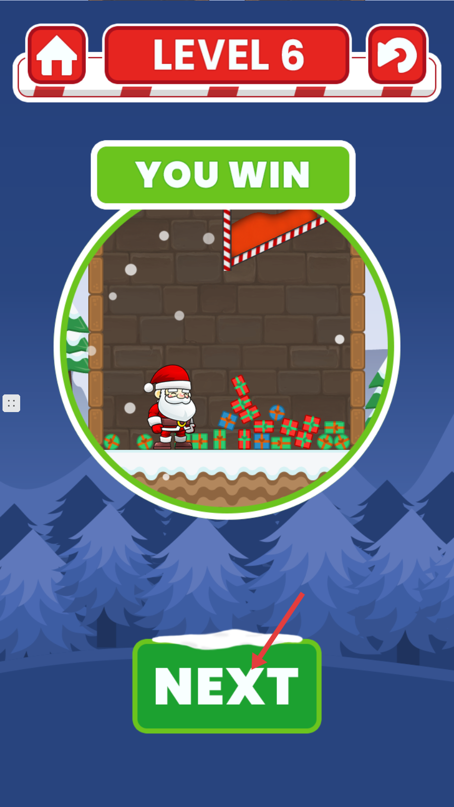 4、成功让圣诞老人到达礼物堆且避开危险后,游戏胜利,点击【NEXT】可进入下一关。