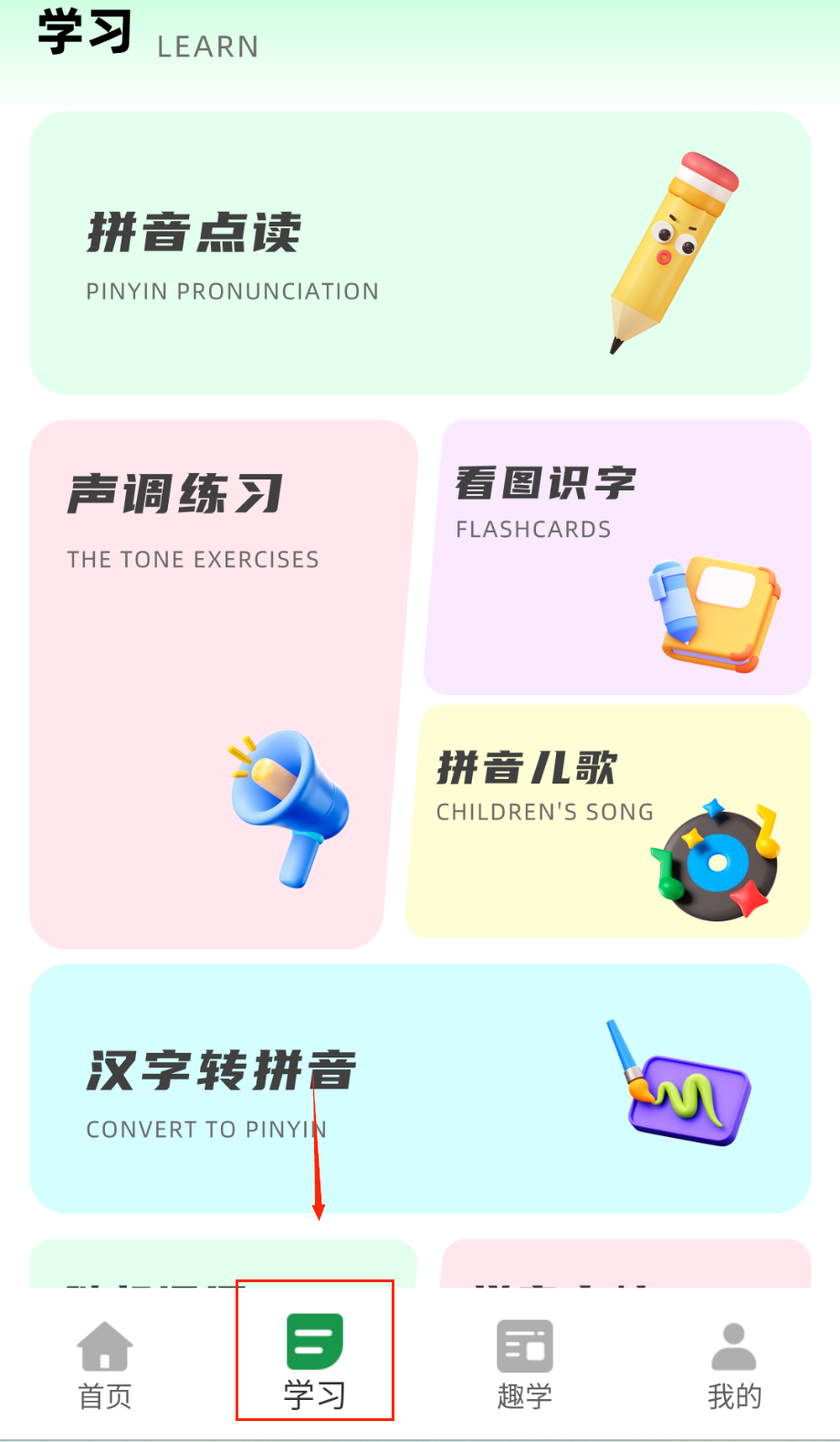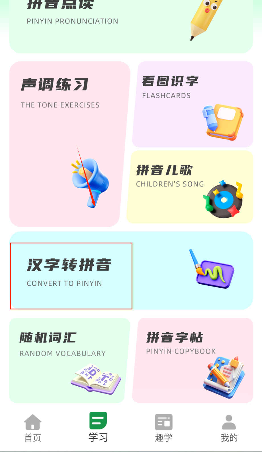 3、在学习中心选择点读练习或声调训练模块,通过互动点击与语音反馈强化拼读能力,同时可体验看图识字与拼音儿歌等功能。