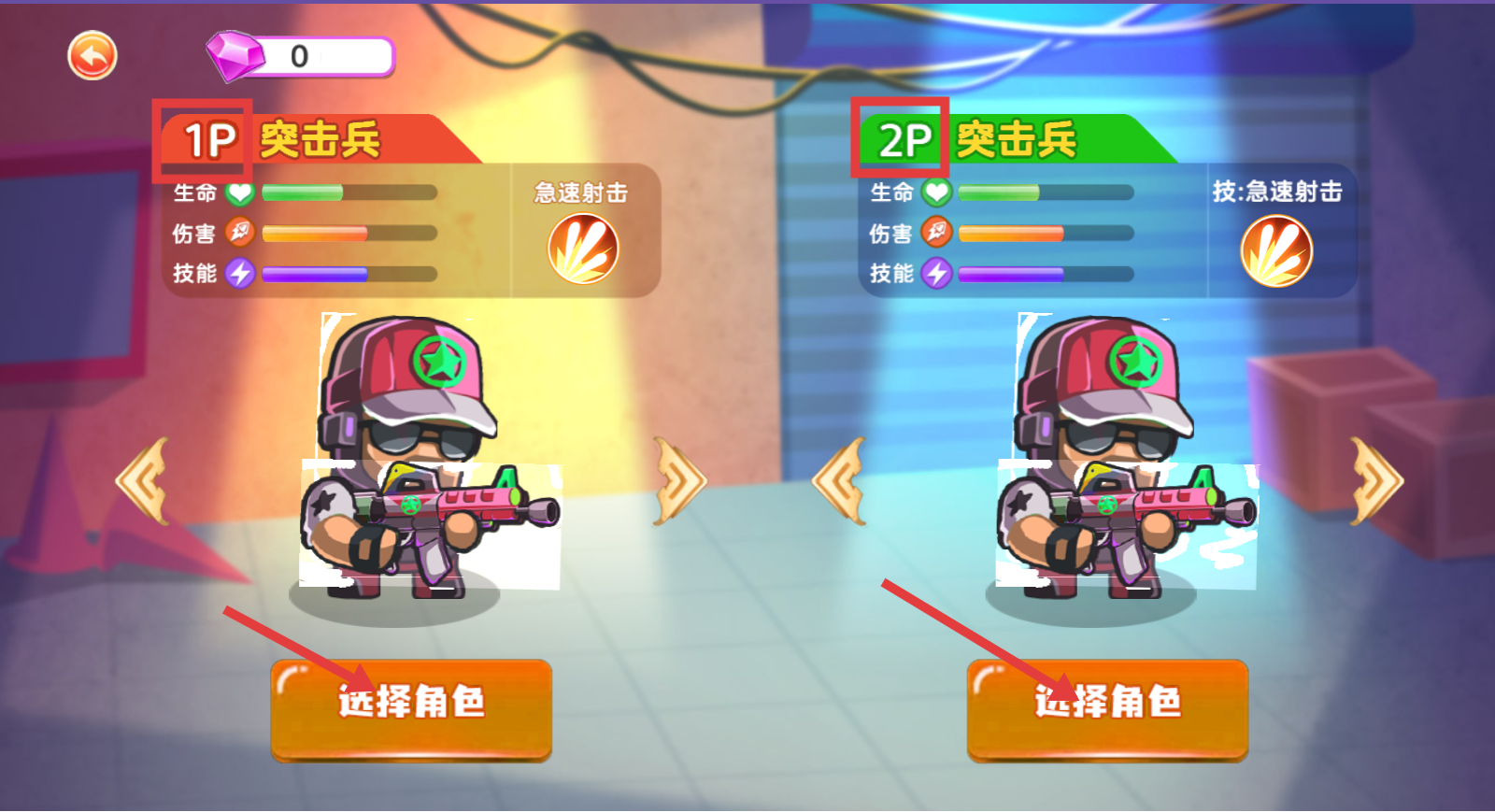 1、进入游戏后,在角色选择界面,可选择【1P】或【2P】的突击兵角色,点击“选择角色”即可进入游戏。