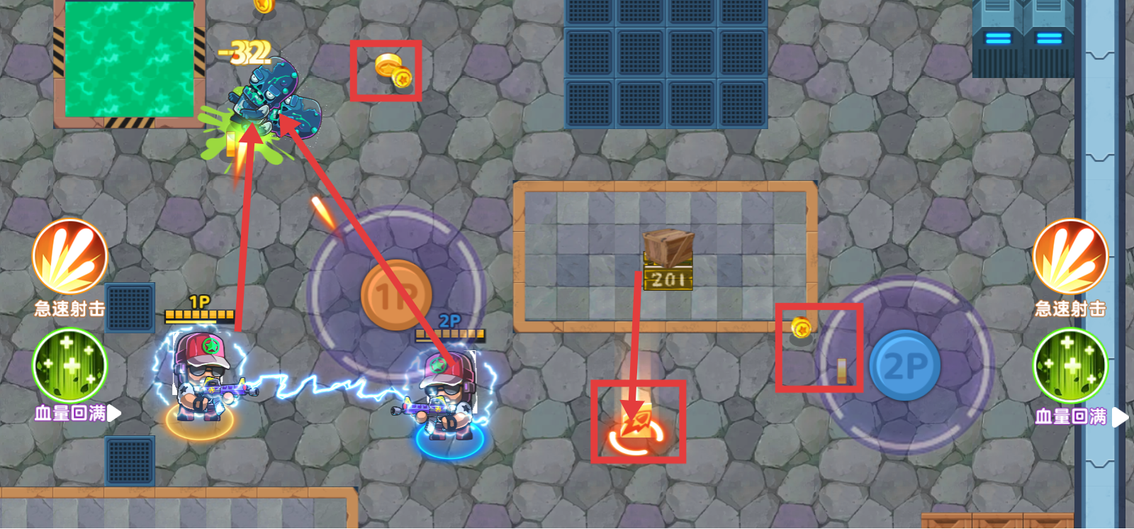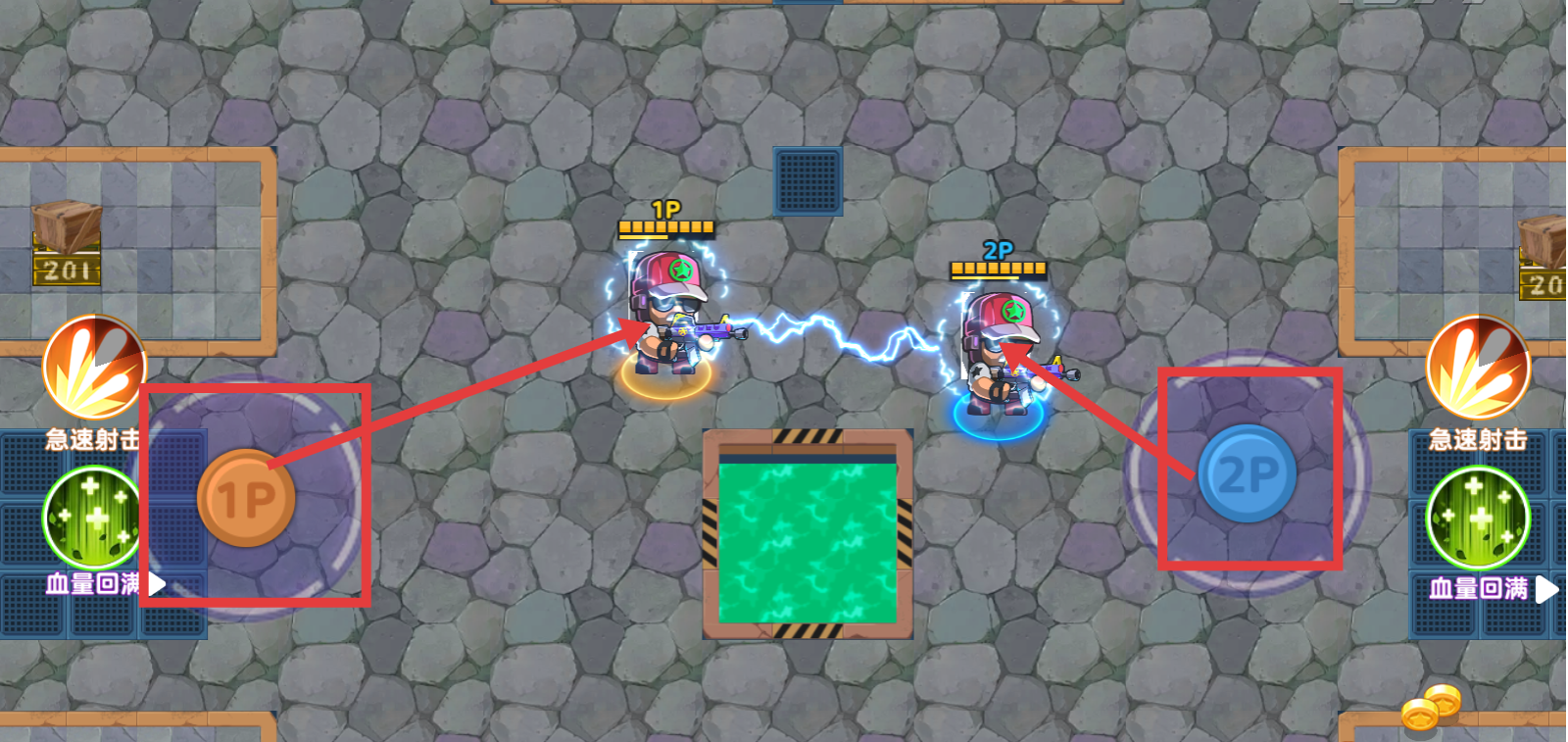 2、通过左侧【1P】和右侧【2P】的按钮操控对应角色移动,还能使用“急速射击”等技能配合战斗。