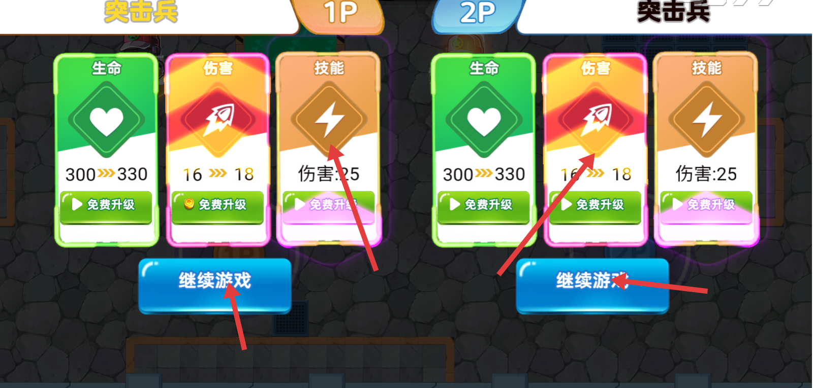 4、战斗间隙,可对角色的生命、伤害、技能进行升级,升级后点击“继续游戏”,提升战力继续冒险。