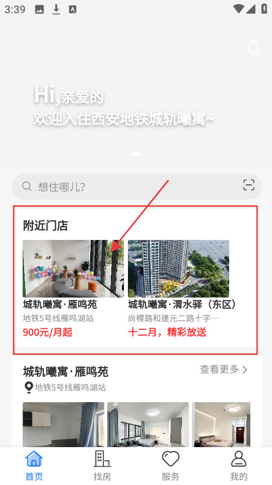 1、首页有【附近门店】板块,能看到不同门店,选感兴趣的,开启租房探索。