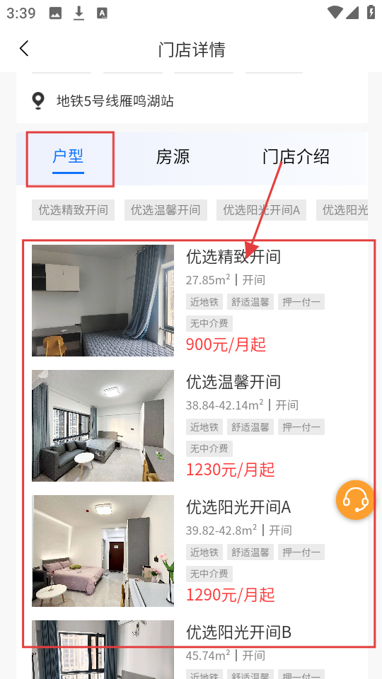 2、进入门店详情,切换到【户型】栏,有多种开间户型,可看面积、价格,挑合适的。
