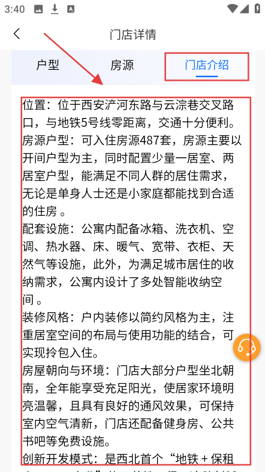 4、切换到【门店介绍】栏,了解位置、配套设施等,全面知晓门店情况,助力租房决策。