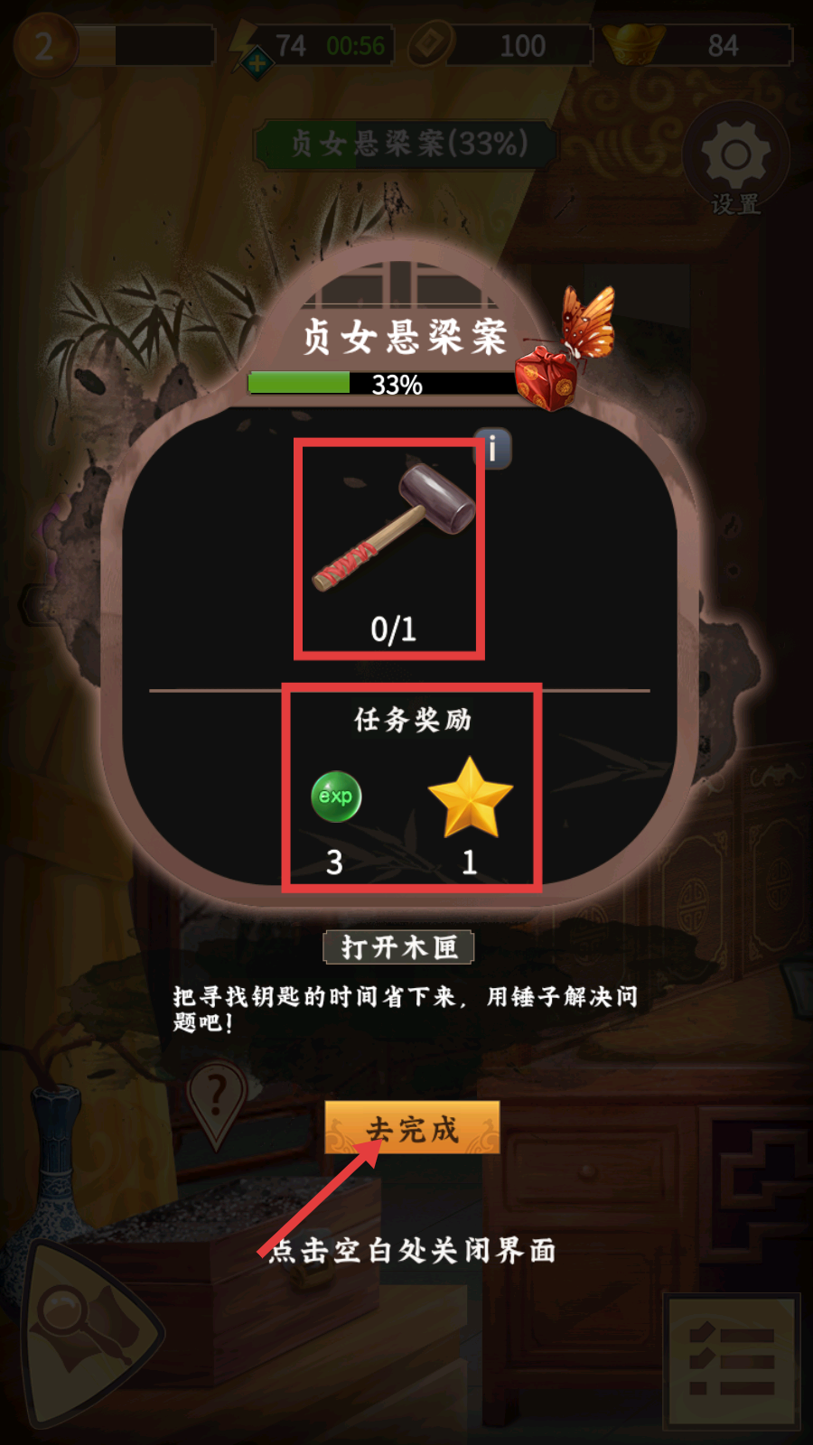 1、在“贞女悬梁案”任务中,需获取锤子道具,完成后可获得3经验与1颗星的任务奖励,点击“去完成”推进任务。