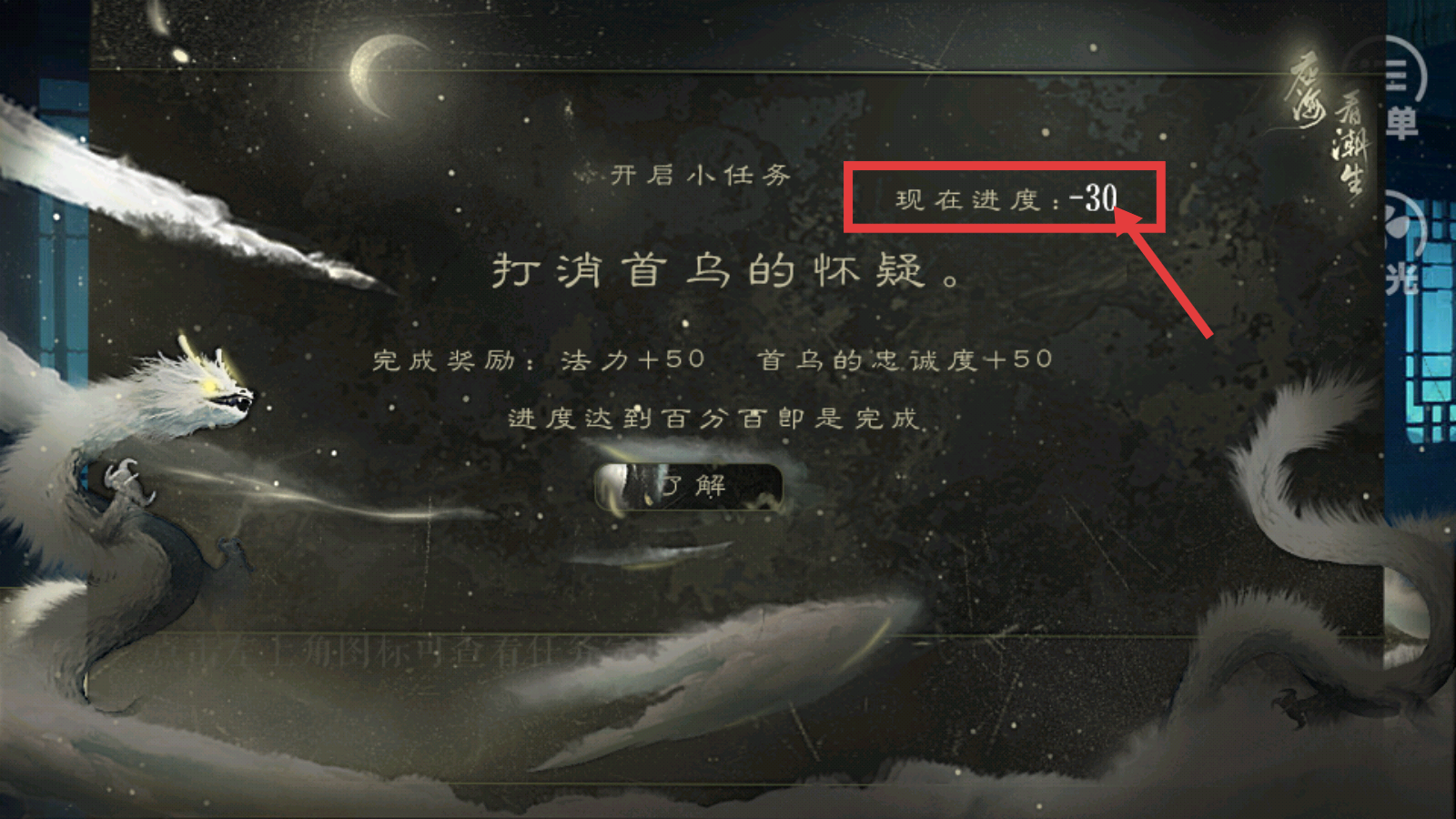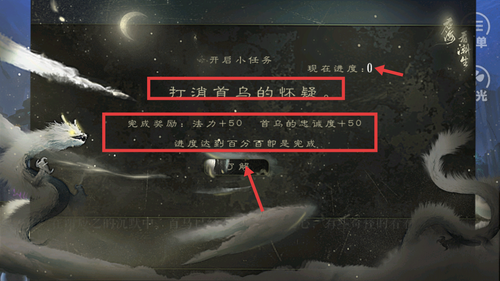 2、游玩中会触发“打消首乌的怀疑”小任务,完成后可获得法力+50、首乌的忠诚度+50,点击“了解”查看任务详情。