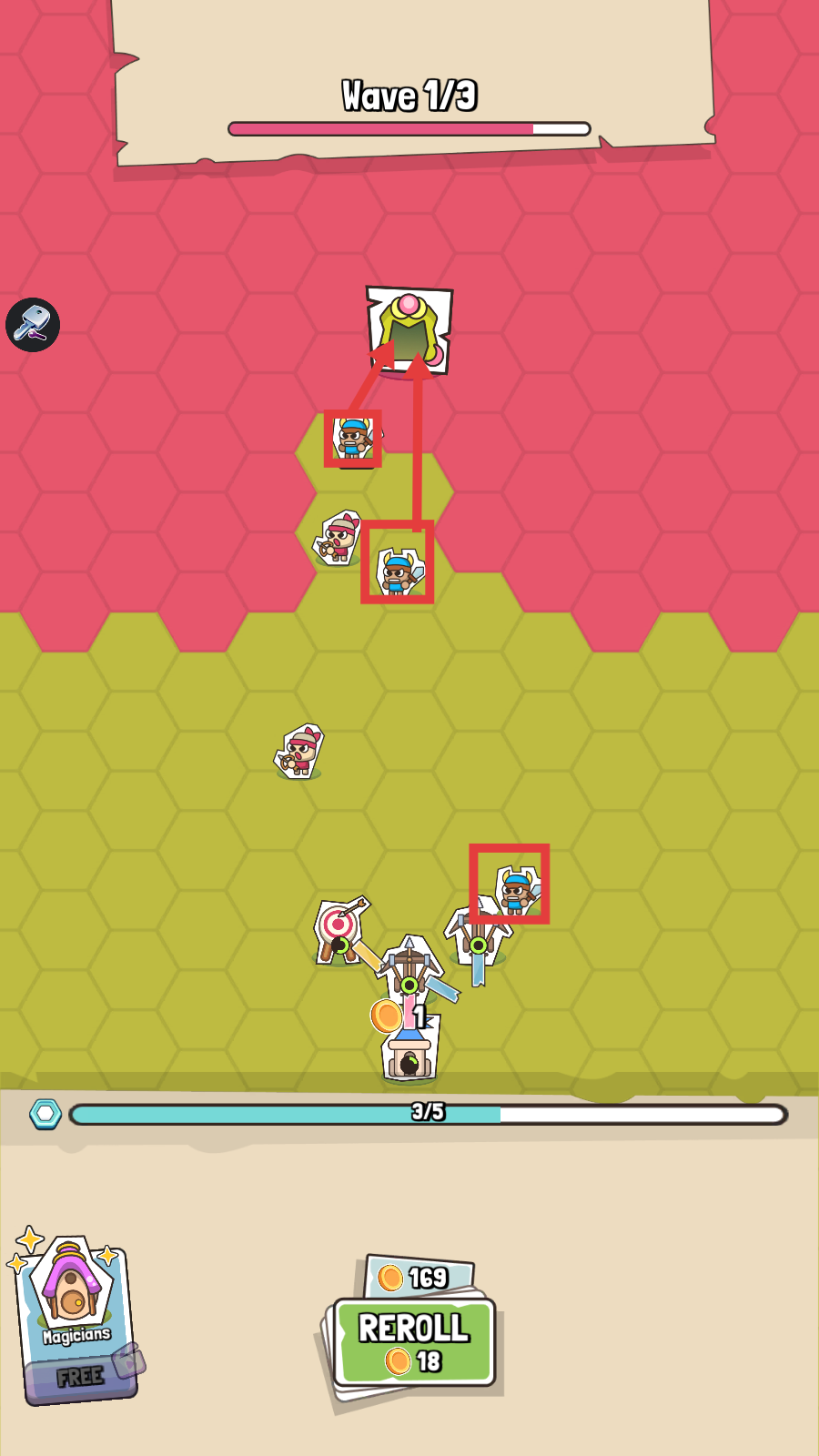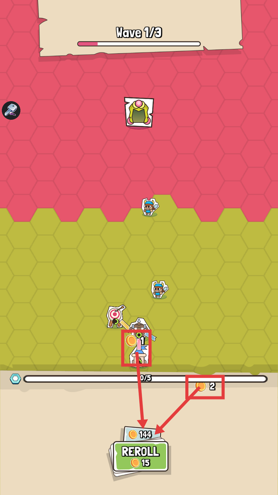 1、Wave-1/3阶段,收集场景中的金币,积累到足够数量后,可花费15金币点击【REROLL】刷新道具或角色,为后续布置做准备。