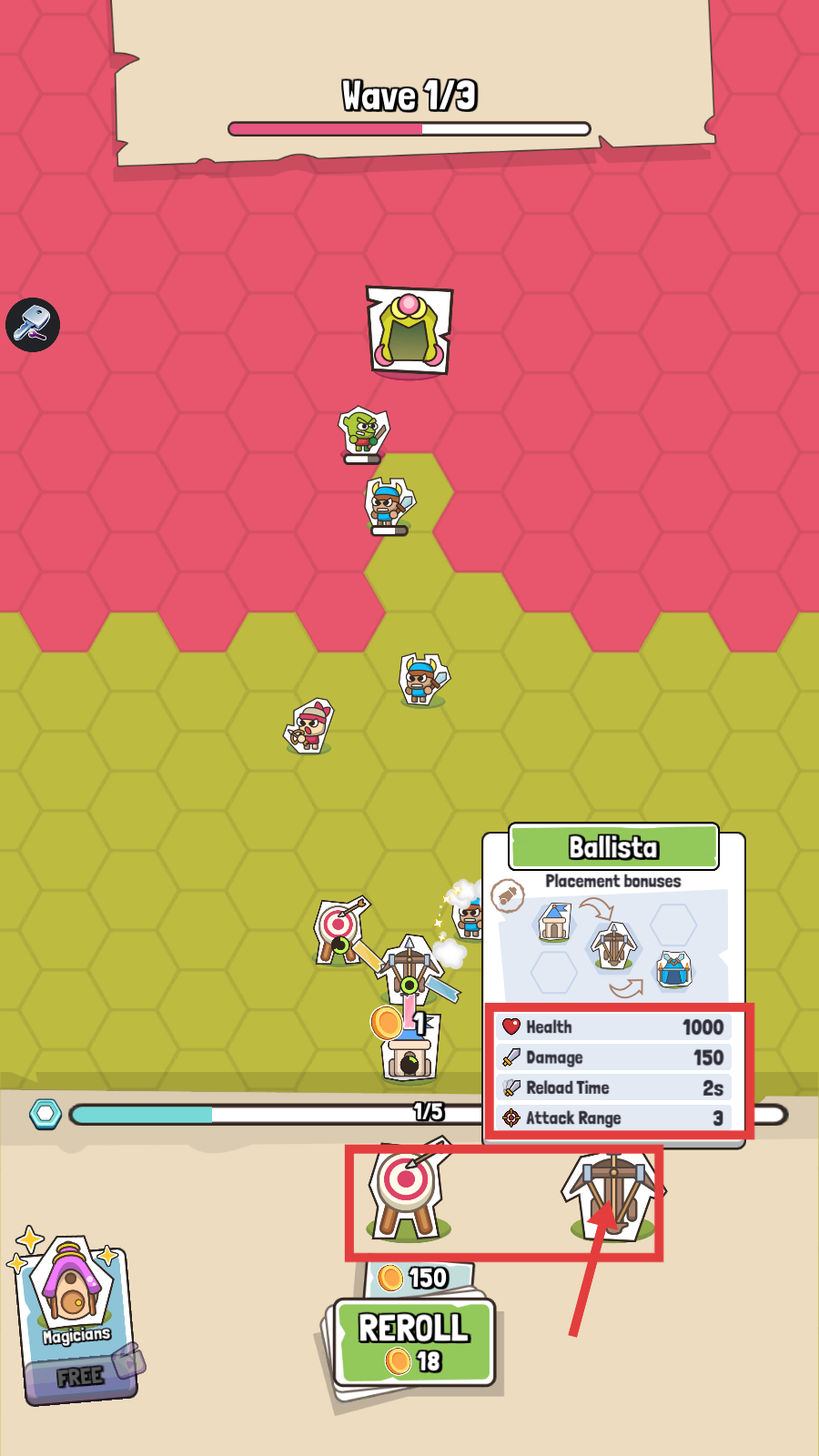 2、建造【Ballista】时,要留意其属性:生命值1000、伤害150、装填时间2秒、攻击范围3,利用射程和伤害优势打击敌人。