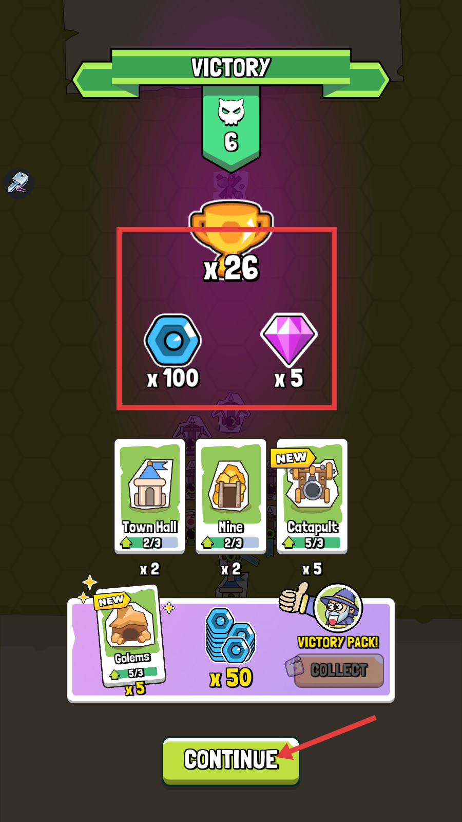 4、成功通关后,会获得奖杯x26、蓝色资源x100、紫色钻石x5等奖励,点击【CONTINUE】按钮,即可继续挑战后续关卡。