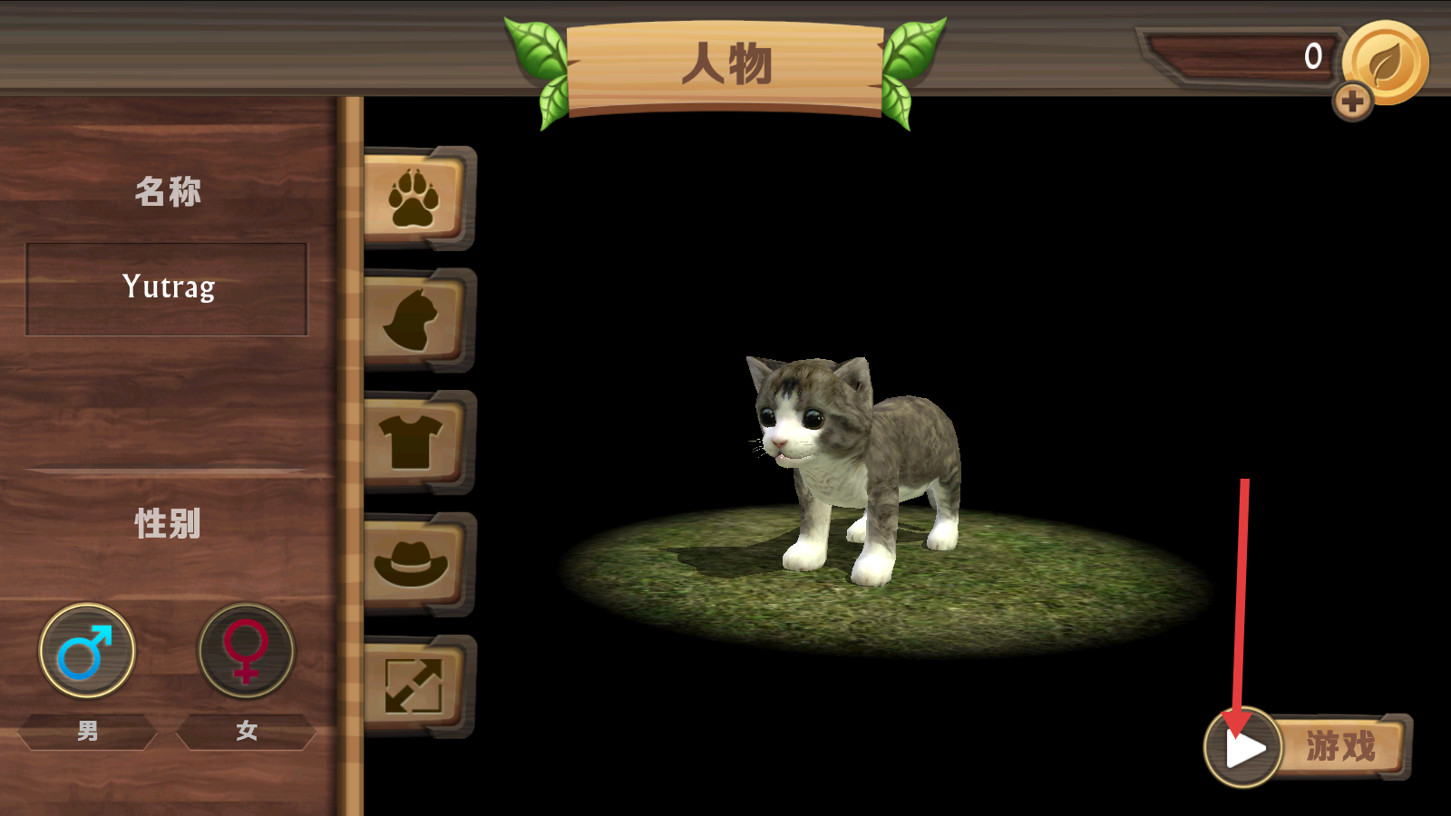 1、创建名为【Yutrag】的猫咪角色,选好性别后,点击右下角【游戏】按钮,进入游戏世界开始冒险。