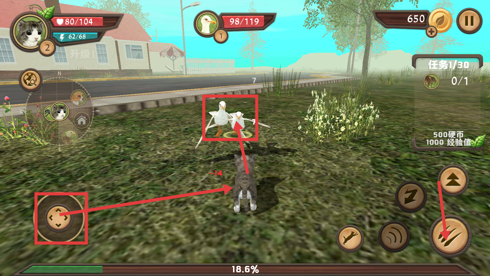 2、冒险中用左下角方向键控制移动,瞄准目标后按右下角攻击键,可攻击像鸟这样的生物,推进【任务1/30】进度。
