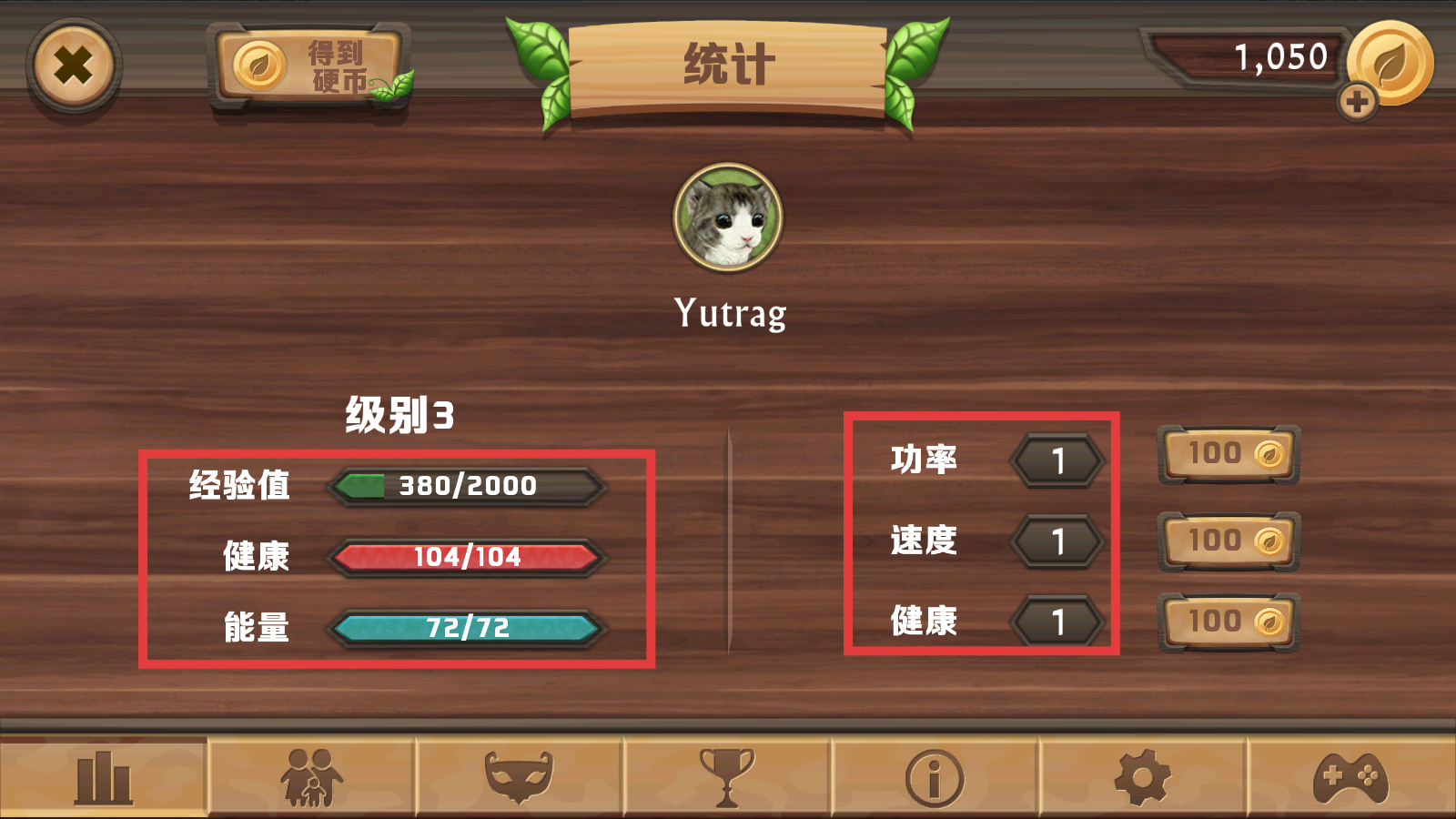 4、进入【统计】界面,可查看角色经验值、健康、能量,还能用硬币升级功率、速度、健康属性,增强角色能力。