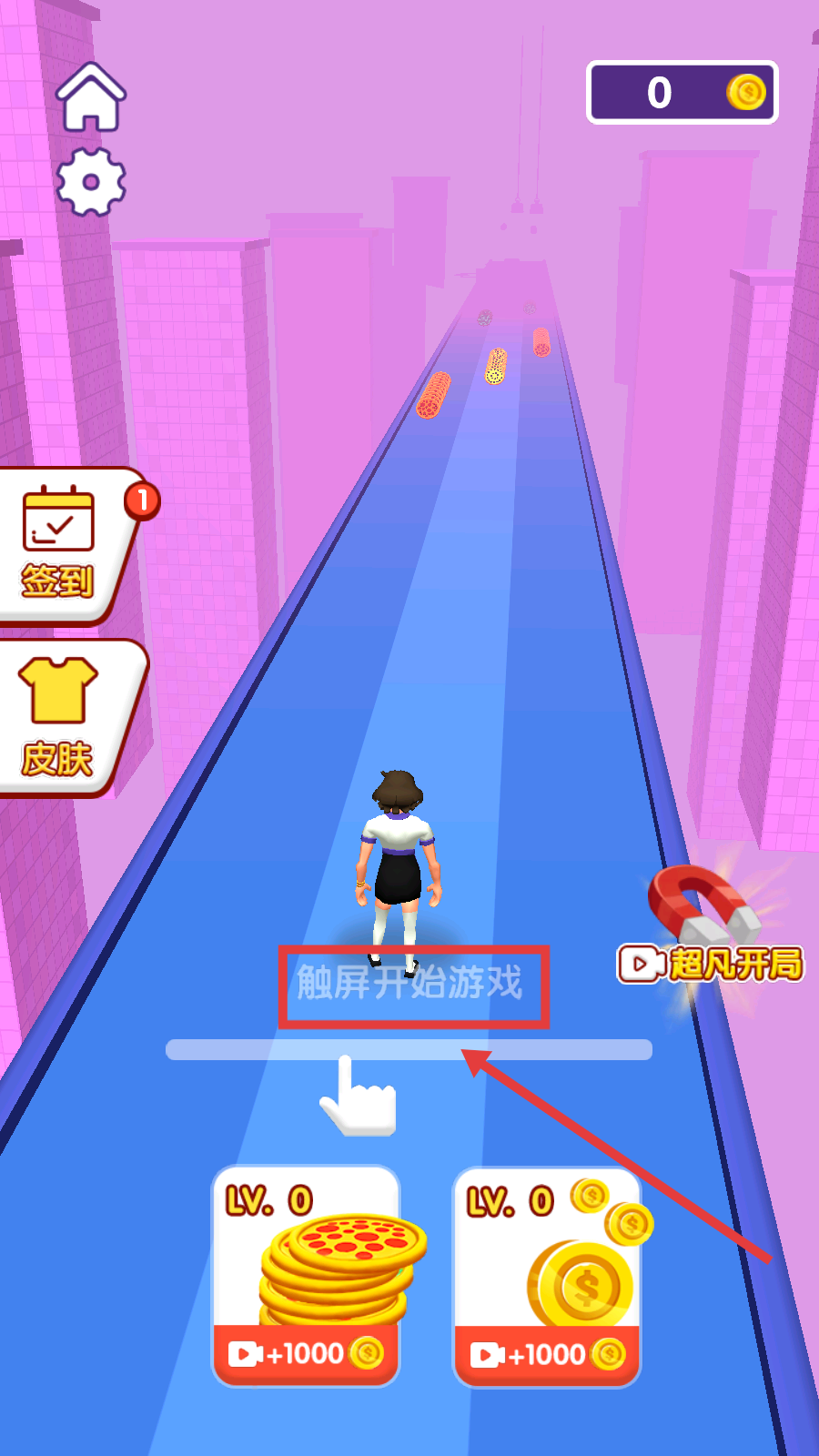 1、开始前可查看左侧【签到】和【皮肤】功能,随后触屏启动游戏,开启跑酷之旅。