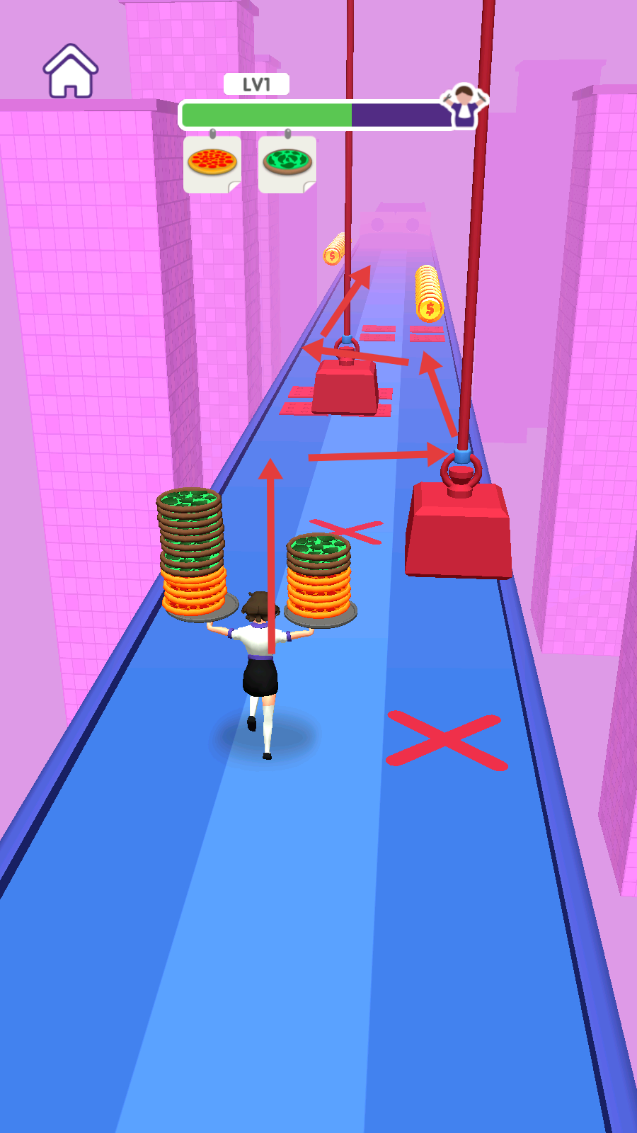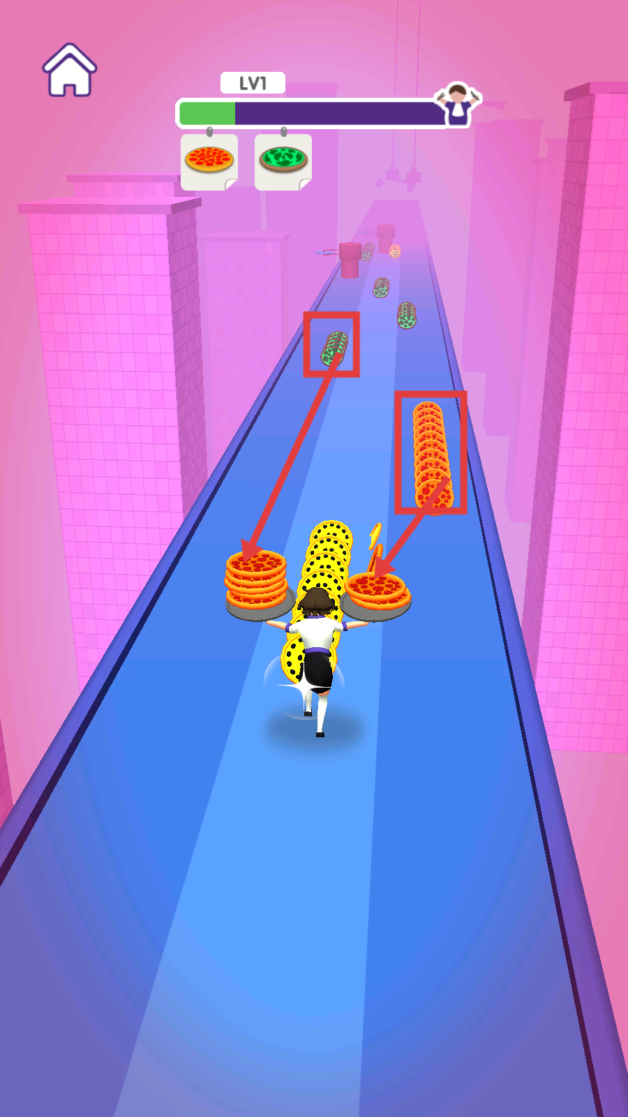 2、在LV1关卡,控制角色左右移动,尽可能收集道路上的披萨,叠加披萨数量为通关积累资源。