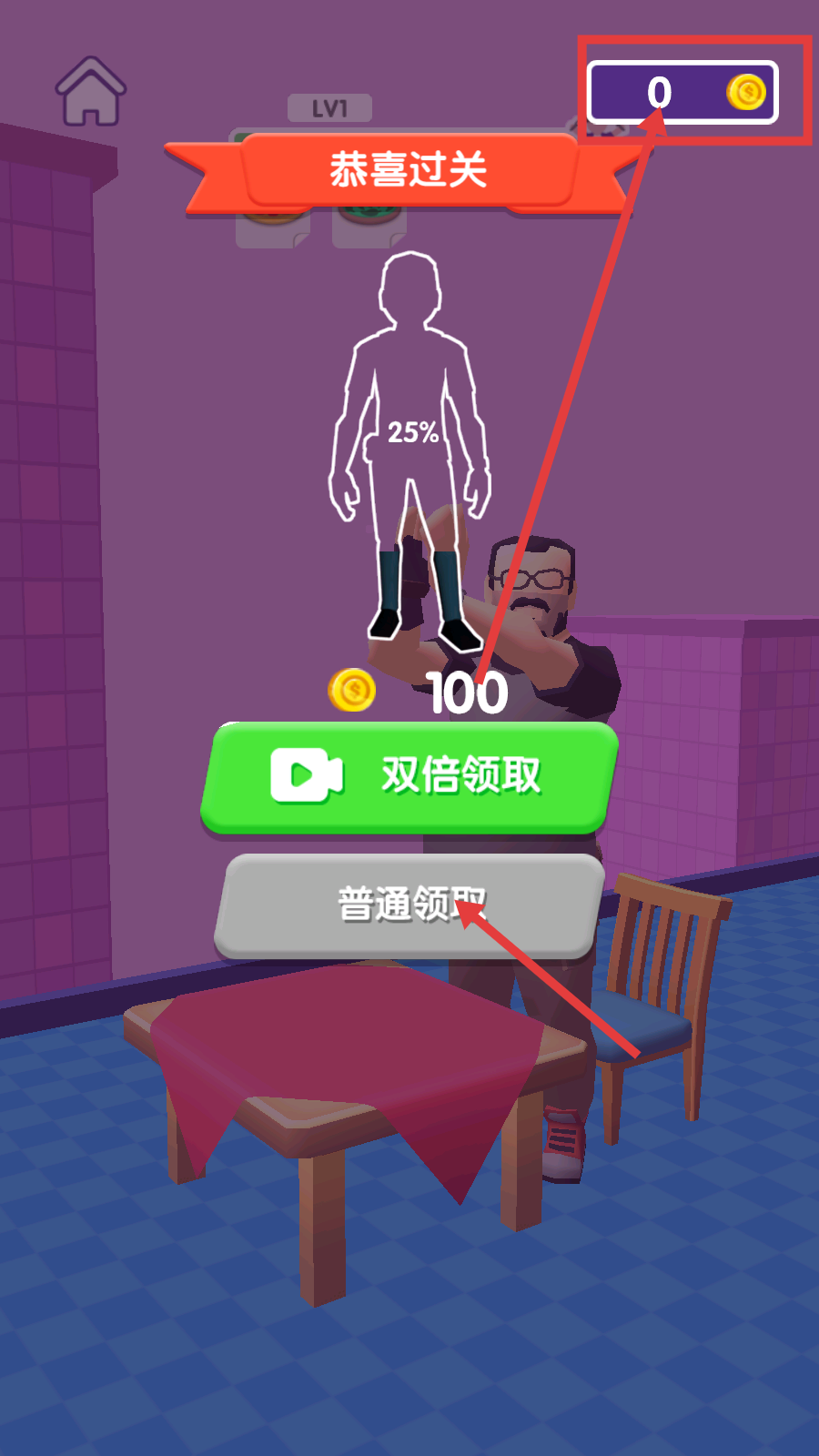 4、通关后会显示【恭喜过关】,可选择【普通领取】获得金币,也能观看视频选择【双倍领取】来积累更多金币。