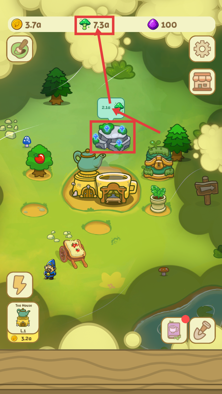1、优先收集蘑菇资源,点击发光石块区域,能快速积累蘑菇,为后续茶叶升级做准备。