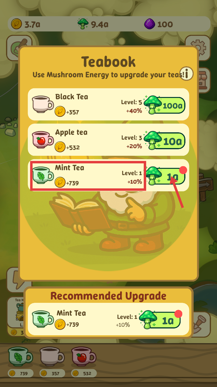 2、进入【Teabook】界面,使用蘑菇能量升级茶叶,如升级【Mint-Tea】,可提升金币收益。