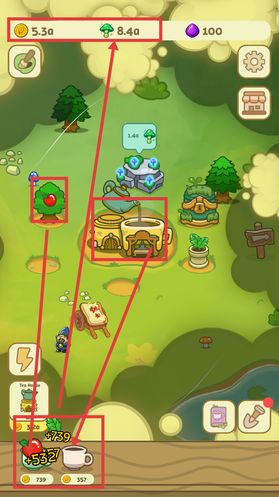 3、让茶馆持续生产茶叶,同时借助苹果树等资源,多获取金币与蘑菇,储备升级资源。