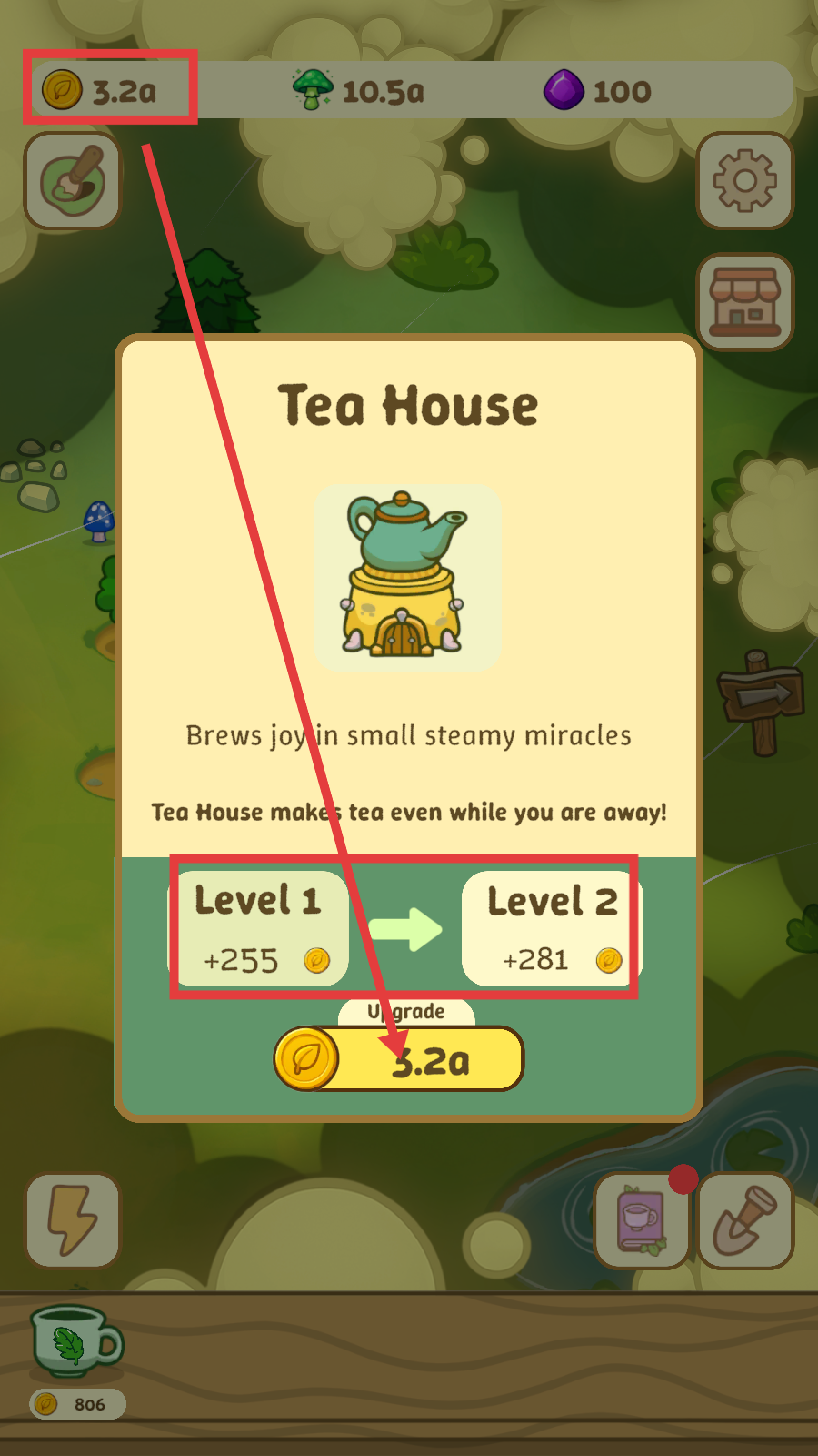 4、金币充足时,升级【Tea-House】,从Level-1到Level-2,能提高金币产出效率,离线也能产茶。
