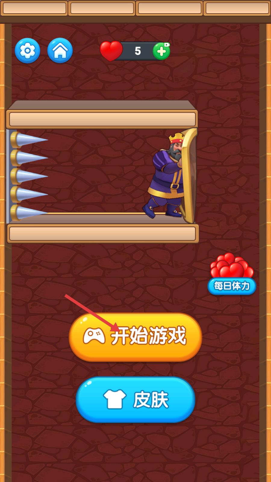 1、进入游戏界面,确认体力为5后,点击橙色【开始游戏】按钮,开启关卡挑战。