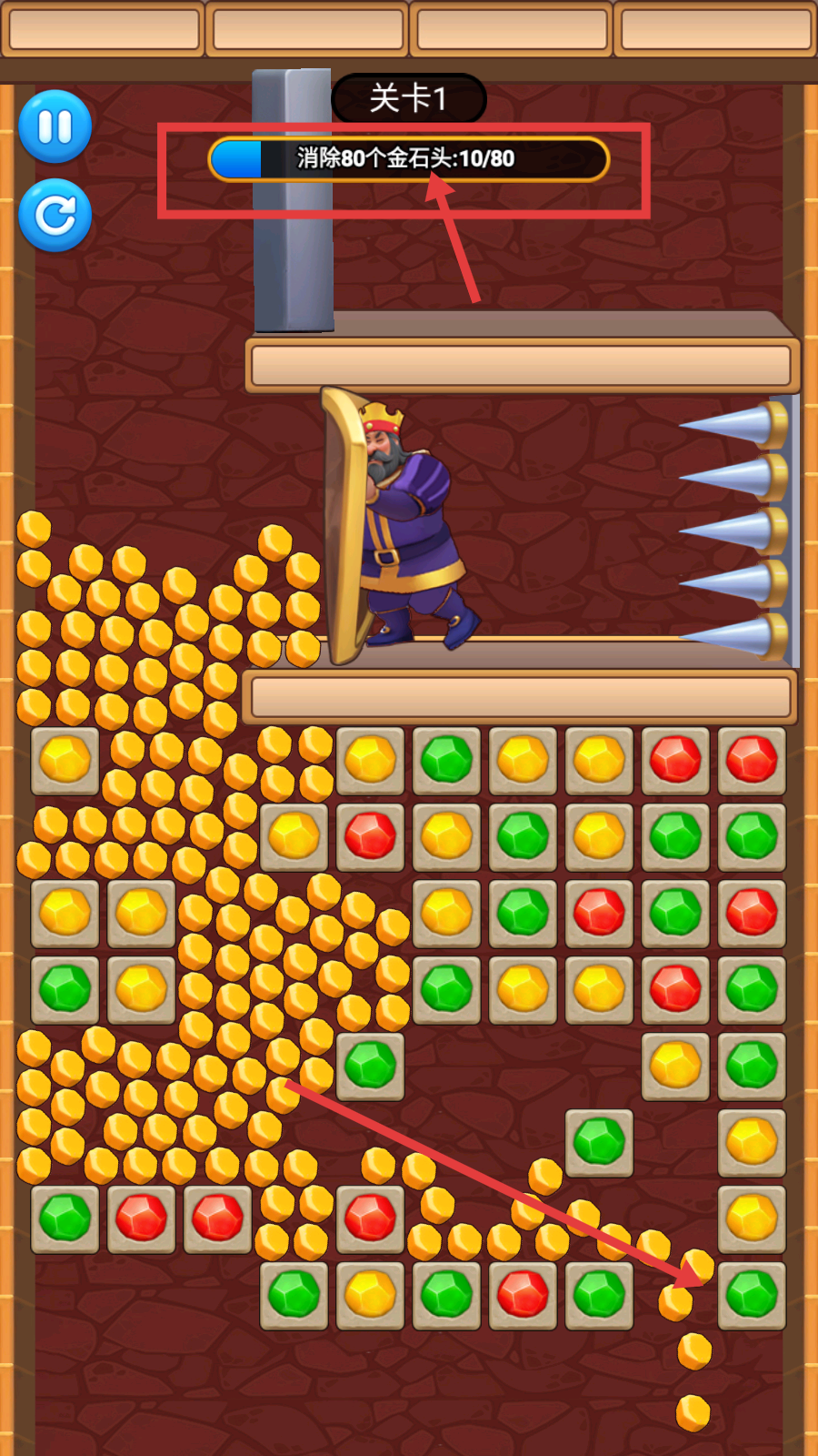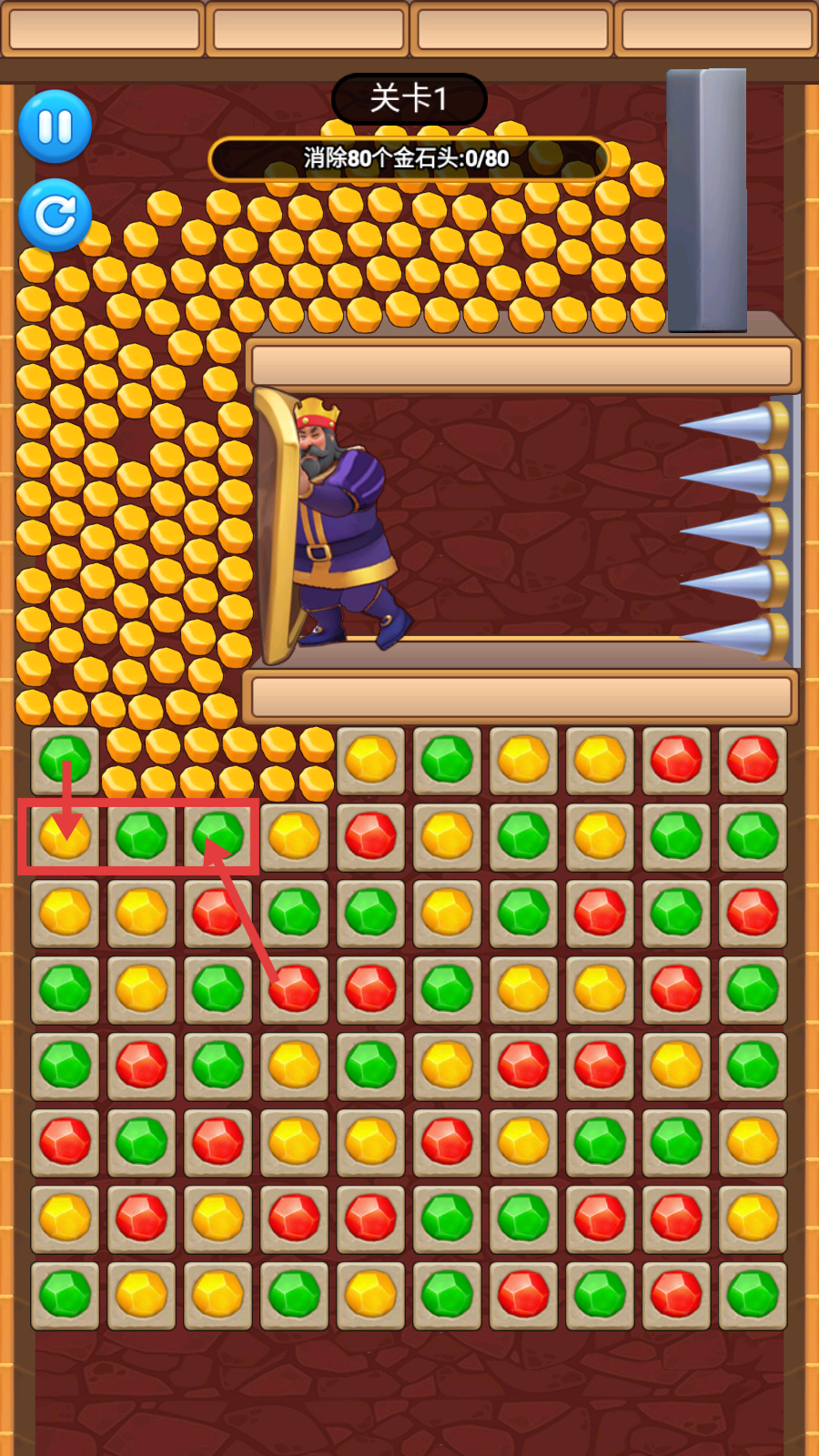 2、在关卡1中,通过匹配相同颜色的宝石来消除,消除宝石时上方的金石头会随之掉落,推进【消除80个金石头】的任务。