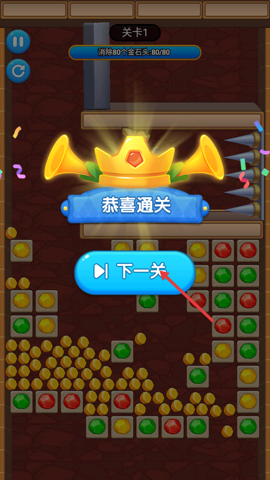 4、当完成【消除80个金石头】的任务后,会显示【恭喜通关】,此时点击蓝色【下一关】按钮,可进入下一个关卡继续挑战。