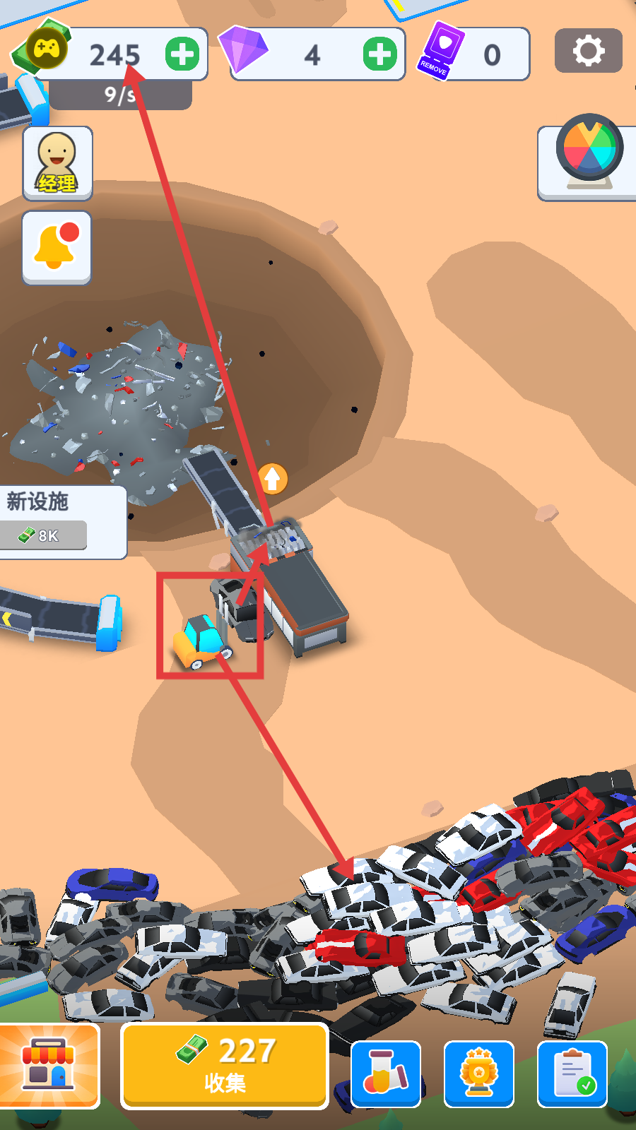 1、操控叉车将废弃车辆运送到粉碎机处,通过粉碎车辆获取资源,同时可积累金币,为后续升级做准备。