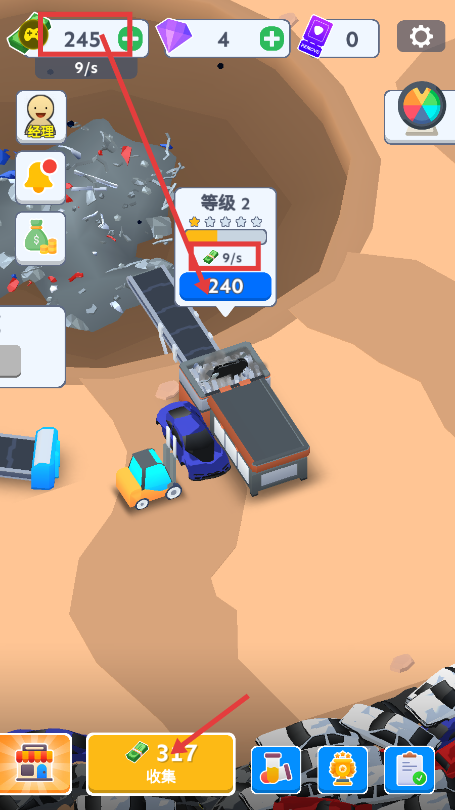 2、点击下方【收集】按钮获取金币,金币足够时升级设施,如将设施升到等级2,能提高金币每秒产出速度。
