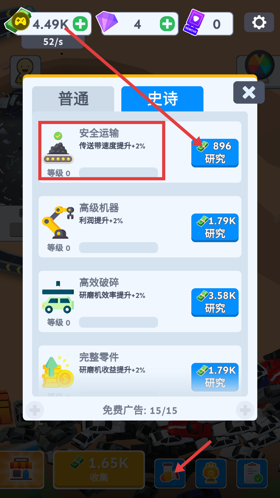 4、进入研究界面,消耗金币研究“安全运输”等科技,如提升传送带速度+2%,进一步优化生产流程,增加收益。