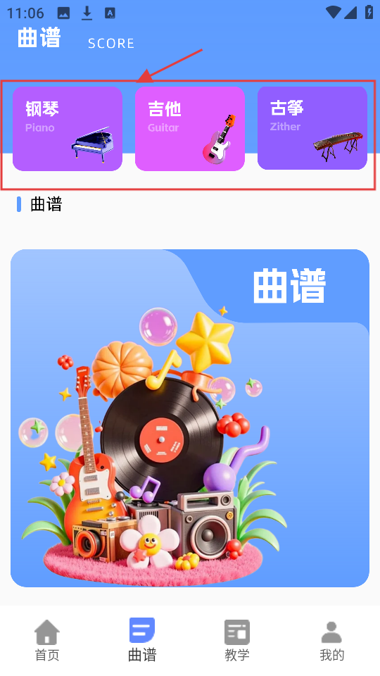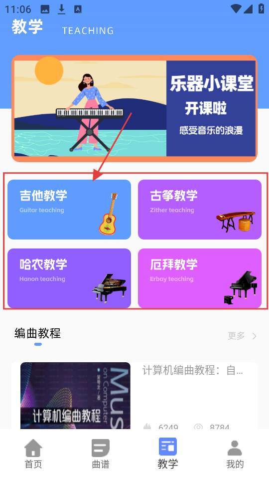 4、教学页面有【吉他教学】【古筝教学】等,想系统学乐器,选对应教学分类,开启学习吧。