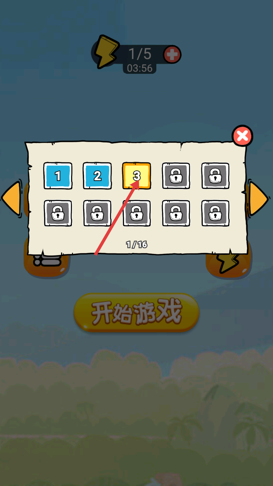 1、进入关卡选择界面,点击黄色高亮的【3】关卡,再按下下方【开始游戏】按钮,进入第3关挑战。