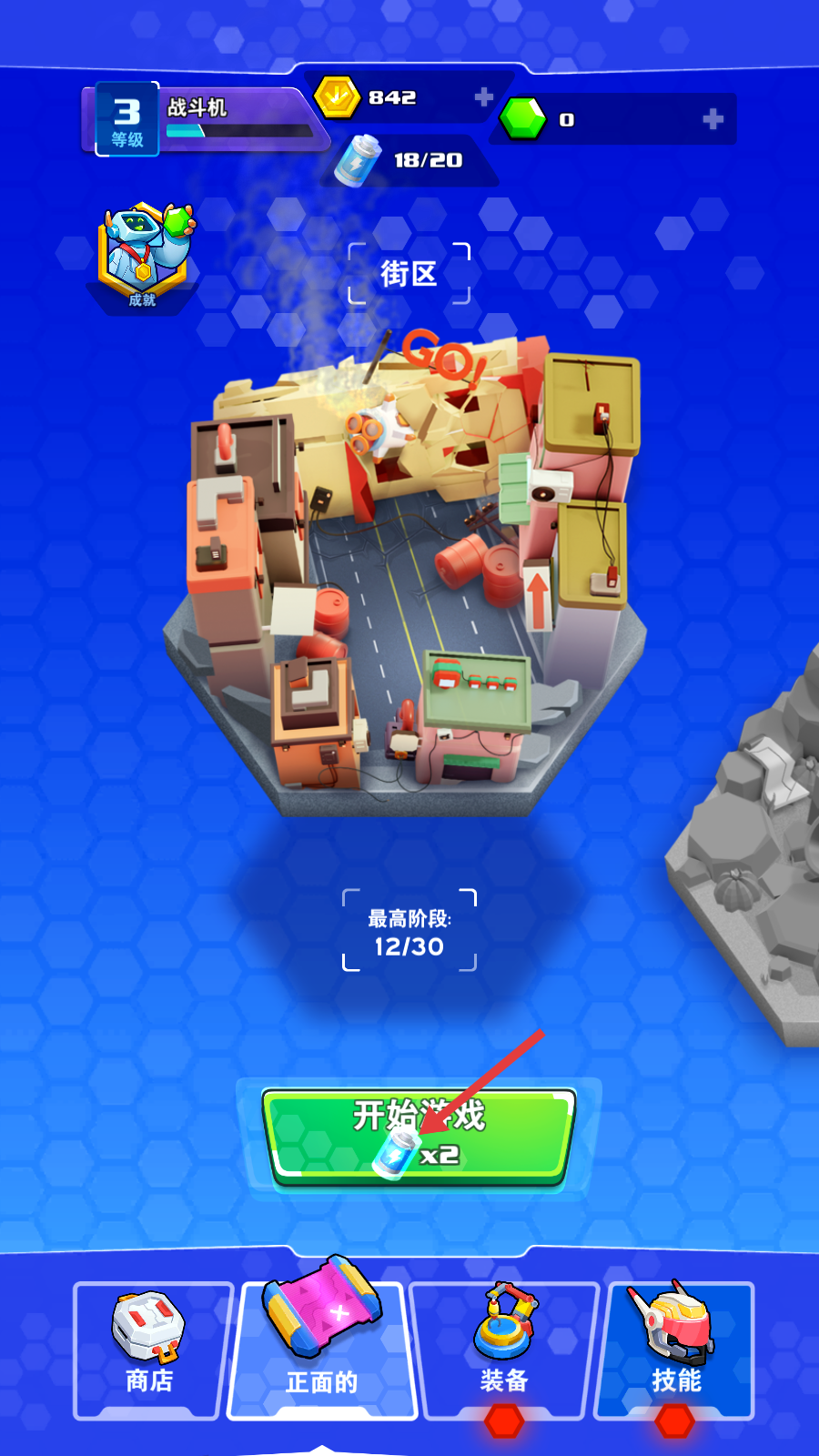 1、进入初始界面,点击绿色【开始游戏】按钮,消耗2个能量道具,即可进入街区关卡开启冒险。