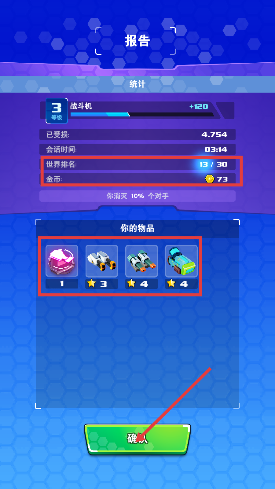 4、关卡结束后,在报告界面可查看战机等级、世界排名(如13/30)、获得的金币与星级物品,点击【确认】可继续游戏或强化战机。