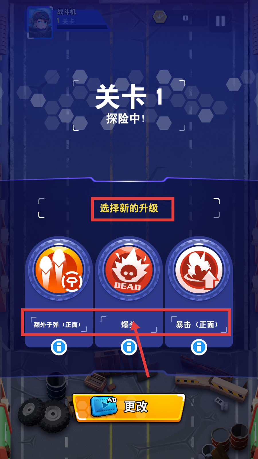 2、在关卡1“选择新的升级”时,可根据战斗需求,挑选【额外子弹(正面)】【爆炸】或【暴击(正面)】,增强战机战力。