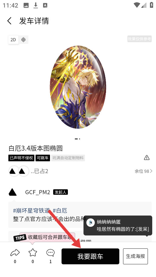 2、进入【白厄3.4版本图椭圆】发车详情,喜欢的话点【我要跟车】,就能参与拼车啦。