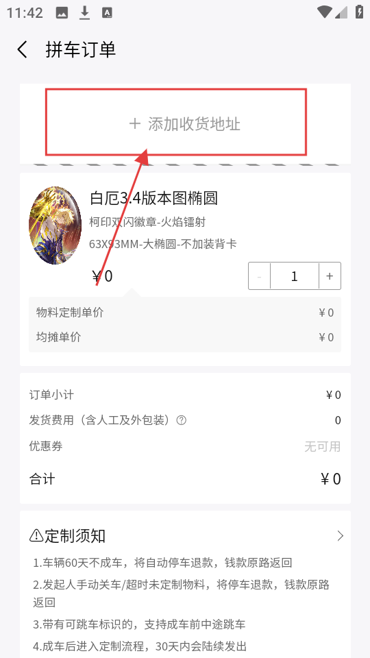 3、拼车订单页面,先点【+添加收货地址】,填好地址,才能顺利收到拼车物品哦。