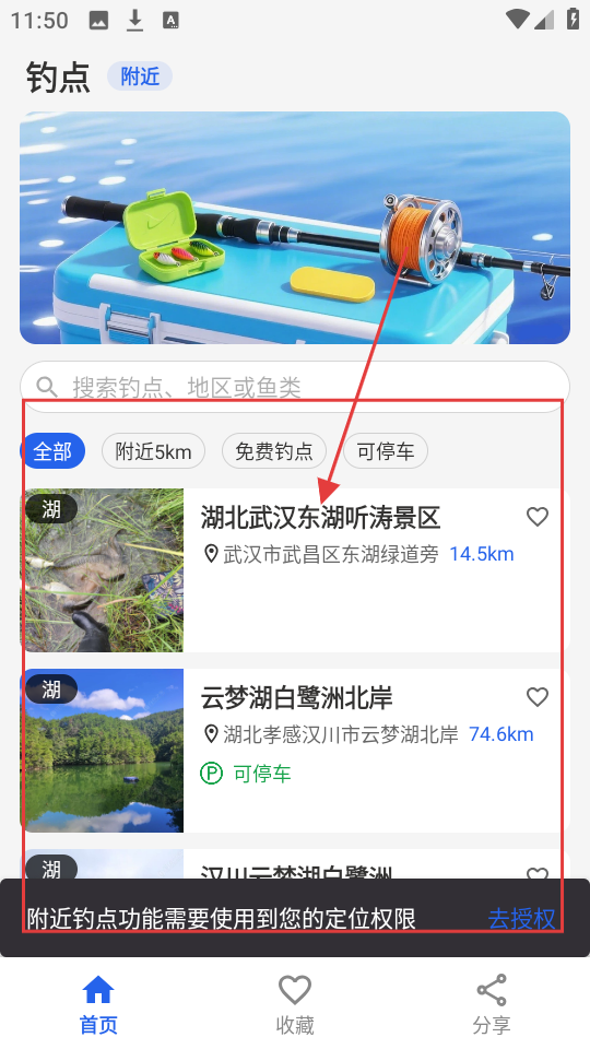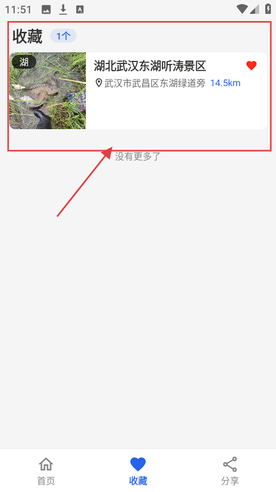 4、进入收藏页面能看到收藏的钓点,像【湖北武汉东湖听涛景区】,下次去直接选,超省事。