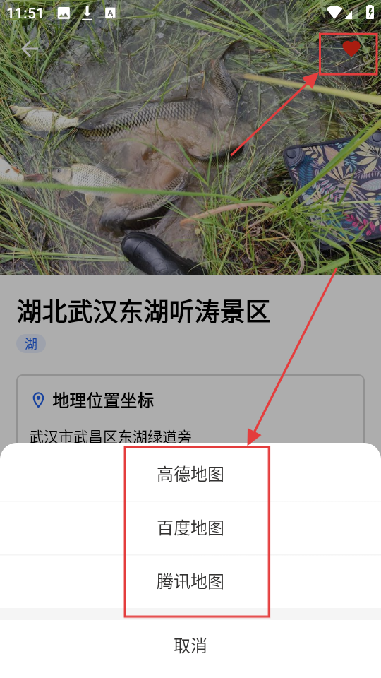 3、点击后能选【高德地图】【百度地图】等,选常用的,导航更顺手。点右上角爱心,还可以将喜欢的钓点进行收藏哦。