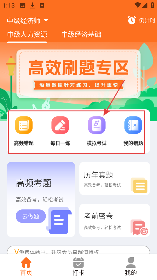 1、中级经济师学习页有【高频错题】【每日一练】等,想模拟考试,点【模拟考试】,超方便。