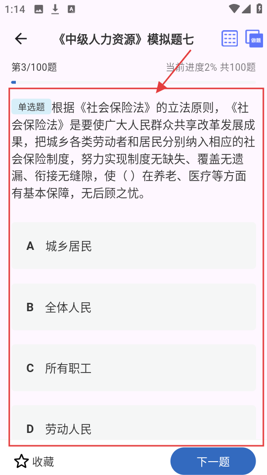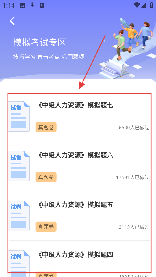 2、进入模拟考试专区,有《中级人力资源》模拟题,选一套,比如模拟题七,开始刷题。