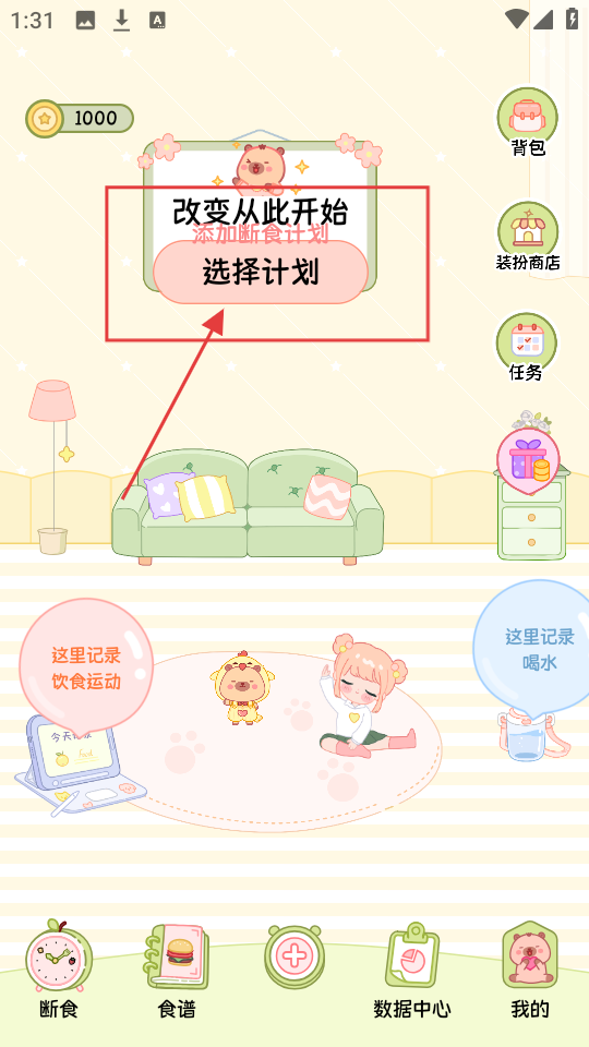 1、首页有“改变从此开始”提示,想开启断食计划,点【选择计划】。