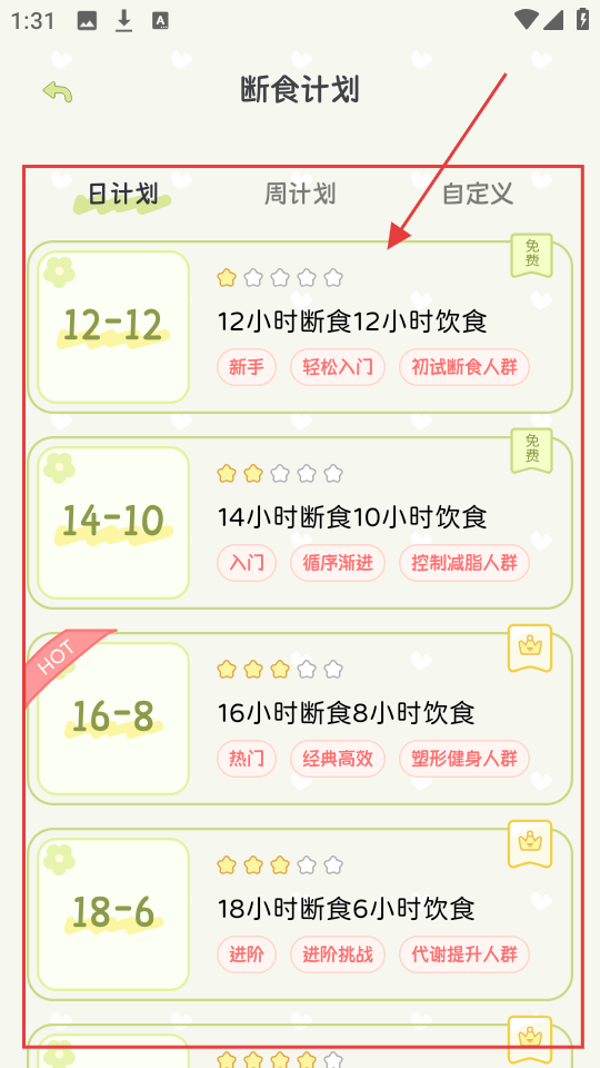 2、断食计划页有日计划、周计划等,选适合自己的,像【12-12】【14-10】都可。