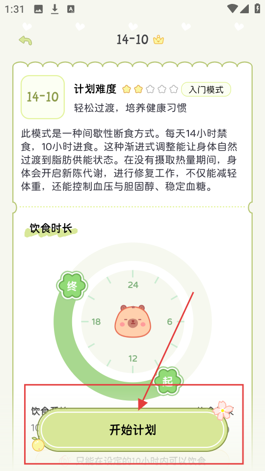3、选好计划,比如【14-10】,看清楚介绍,点【开始计划】,就能执行啦。