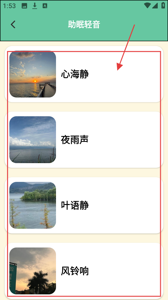 2、助眠轻音列表有【心海静】【夜雨声】等,选喜欢的,比如【夜雨声】,点进去听。
