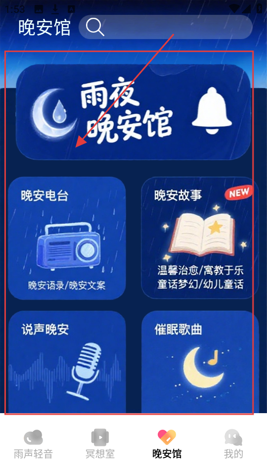 4、晚安馆页有【晚安电台】【晚安故事】等,选感兴趣的,像【晚安电台】点击收听,可以更好地进行解压放松哦。