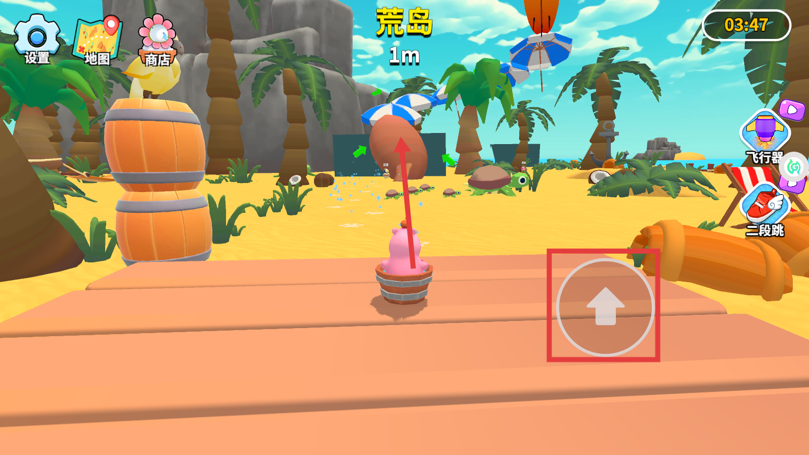 1、在【荒岛】场景,点击右侧向上箭头按钮,操控角色朝着前方目标移动,留意周围木桶等场景元素推进探索。